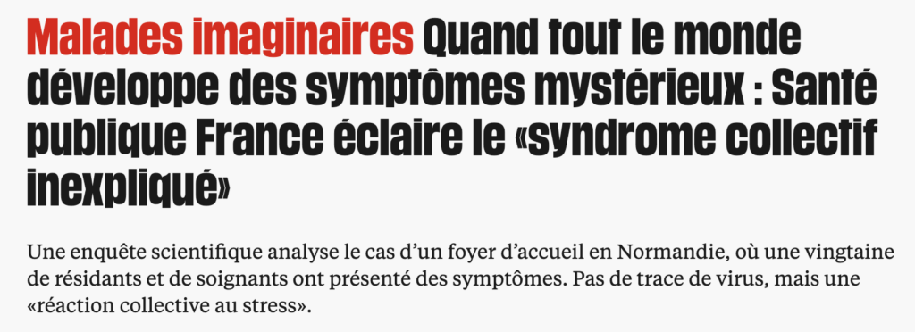 Un récent article de Libération revenait sur un phénomène constaté dans un foyer d’accueil pour des adultes avec des troubles du spectre autistique en Normandie : plusieurs personnes ont présenté simultanément des symptômes (maux de tête, irritations, gêne respiratoire), sans cause environnementale clairement identifiée.