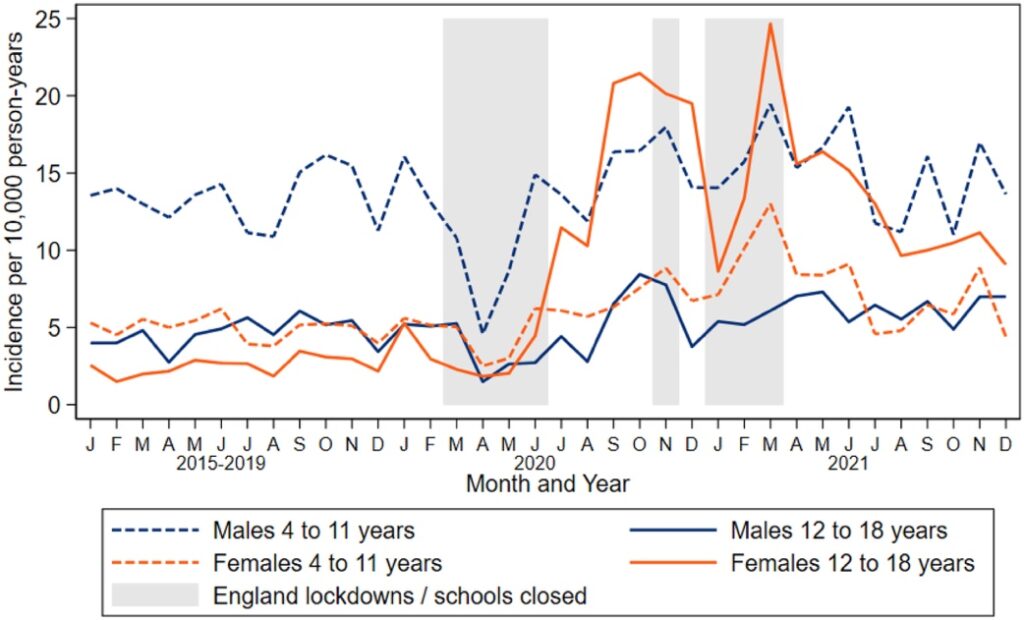 Une étude rapporte l’incidence des tics en Angleterre autour de la pandémie. On y voit une explosion de l’incidence chez les adolescentes, avec des chiffres multipliés jusqu’à un facteur 10. Les symptômes diminuaient drastiquement quelques mois après une consultation avec un spécialiste.
